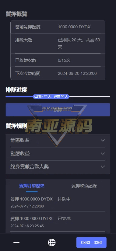 dydx购买额度时是排队兑换,每次排队期为60天,兑换成功后质押股权,质押股权后21天起可以得到一次收益,每21天收益一次投入额得20%,得到收益的20%里面的10%为燃料费,10%自动复投,80%转到可用账户。